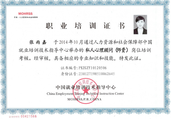 2、 通过结业考试的学员将获得由中华人民共和国人力资源和社会保障部中国就业培训技能指导中心颁发的《私人心理顾问(高级)》证书和《私人心理顾问(师资)》证书;